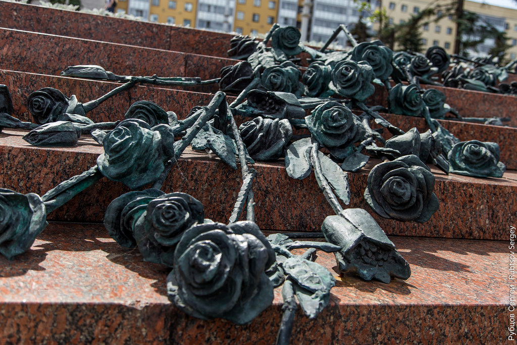 К сожалению, это не все грустные памятники центра Минска, на входе в станцию метро Немига лежат бронзовые розы, который установили здесь после трагедии 1999 года, когда в давке погибло 53 человека: